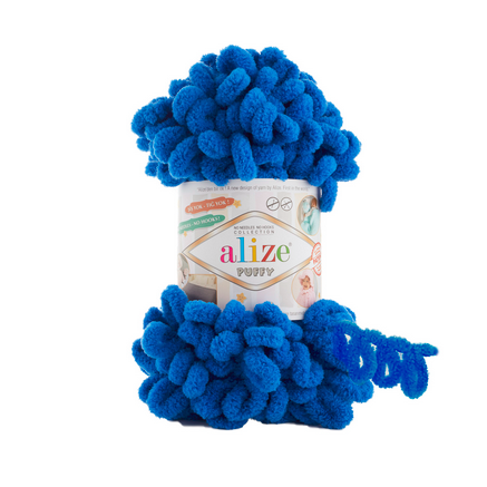 Příze Alize Puffy 141 královská modrá je silnější, ale zároveň velmi jemná a hebká žinylková příze s velkými oky určená pro pletení na rukou.