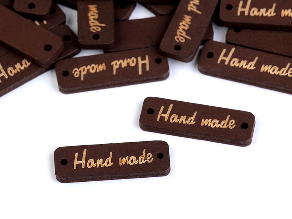 Dřevěnou cedulku obdélníkového tvaru se zaoblenými rohy zdobí jednostranný nápis "hand made". Po stranách jsou dírky, kterými lze provléct šňůrku a cedulku tak pověsit na dekoraci.