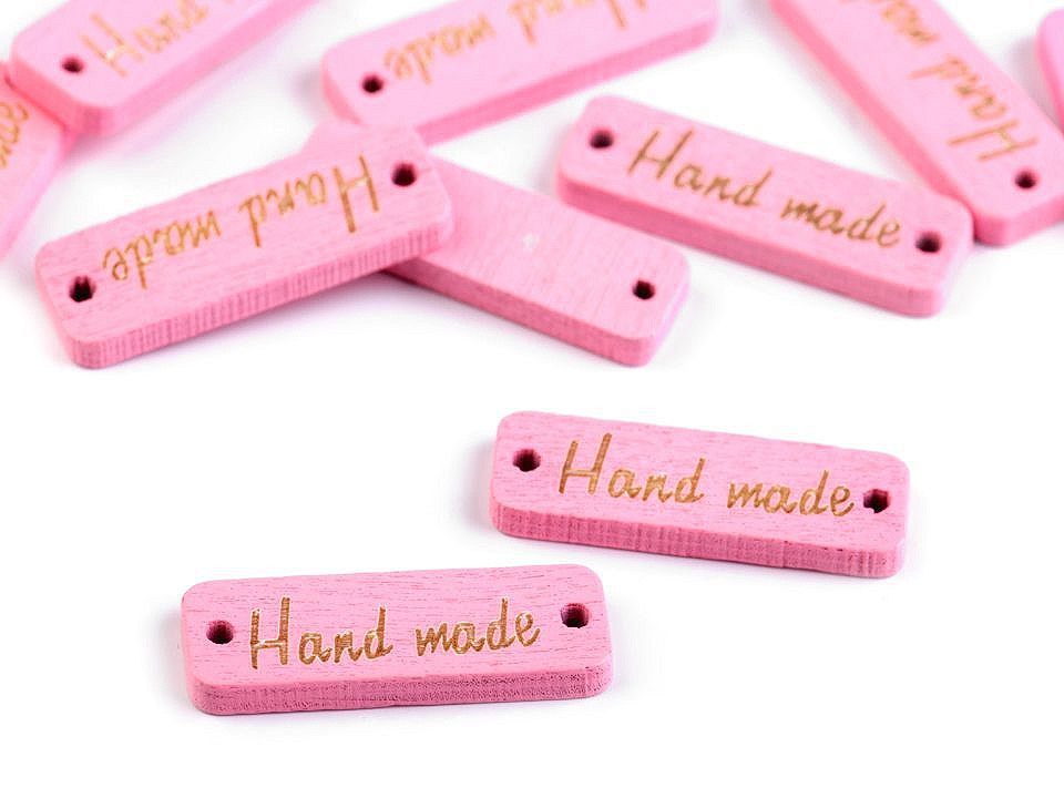Dřevěnou cedulku obdélníkového tvaru se zaoblenými rohy zdobí jednostranný nápis "hand made". Po stranách jsou dírky, kterými lze provléct šňůrku a cedulku tak pověsit na dekoraci.
